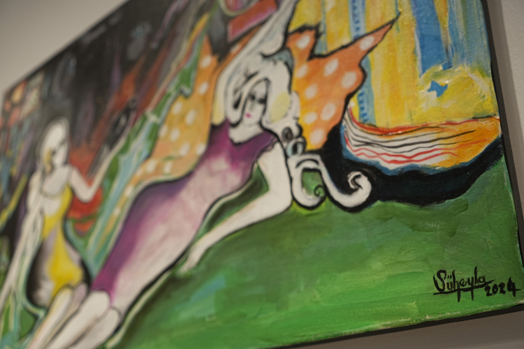 Bu ikinci kişisel sergim. Sergimin konusu ‘Çiçeğin kokusunda, kuşun kanadında kadın'. Resimlerimde konu olarak kadının yüzyıllardır varoluş mücadelesinden yorgun düştüğü ve kendine bir dinlenme alanı oluşturduğu süreci ele almak istedim.