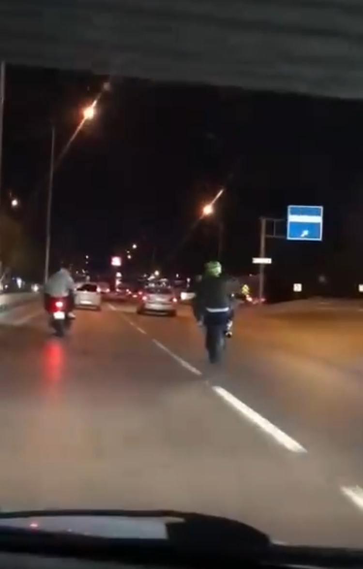 Bir süre bu şekilde giden motosiklet sürücüsü diğer sürücülerin yüreklerini ağza getirirken bir sürücü o anları kayda aldı.