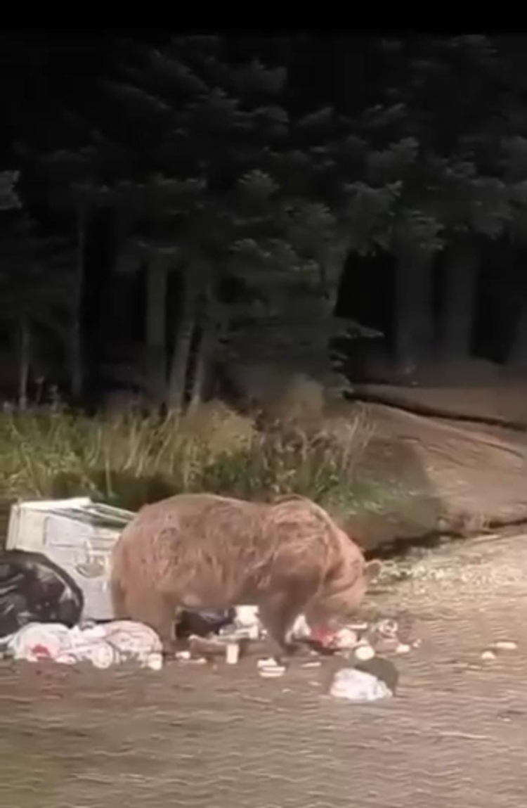Bursa’da acıkan ayı Uludağ’ın turistik bölgesi olan Sarıalan’da çöp konteynerlarında yemek ararken, ayıyı çeken bir vatandaş o anları şarkı söyleyerek izledi.