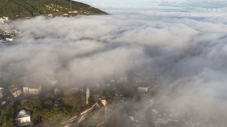 Drone ile havadan görüntülenen Bursa'da binalar sis bulutlarının arasında kaybolurken, pamuklara bürünmüş bir Bursa gibi izleyenleri mest etti.