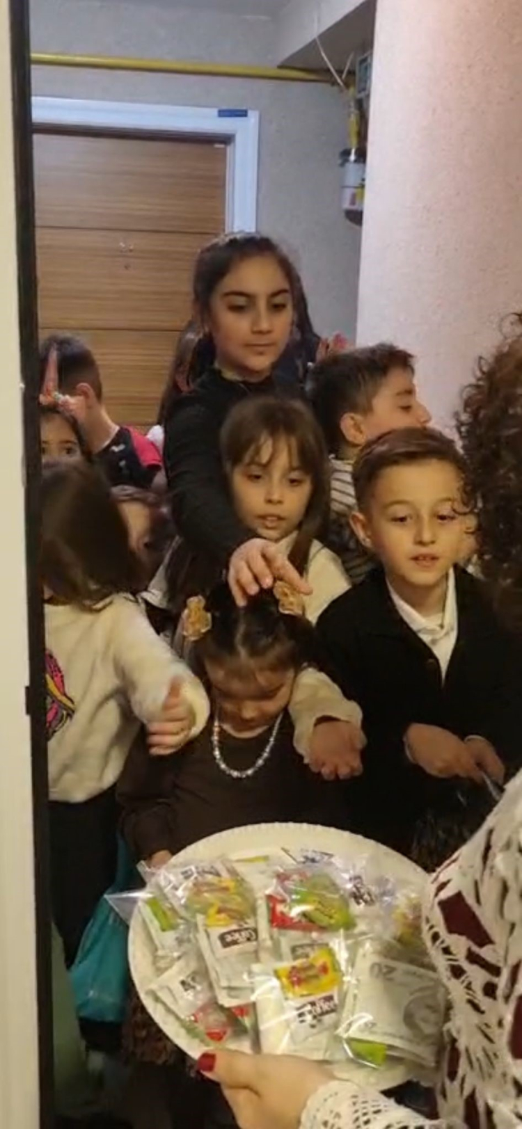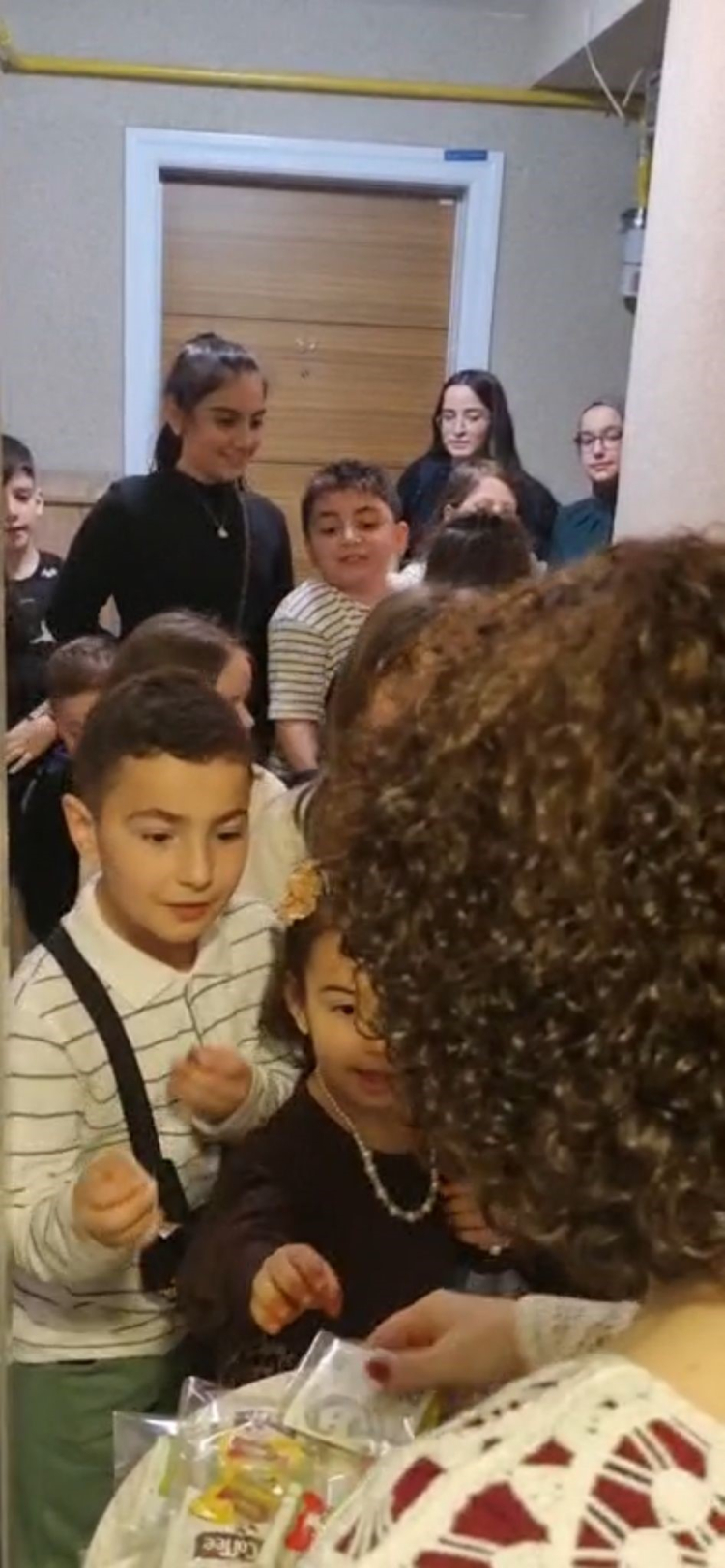 Bursa'da bir sitede her bayram olduğu gibi bir yetişkinle beraber 20 çocuk, sitede oturan komşularının kapılarını tek tek çalarak bayramını kutladı.
