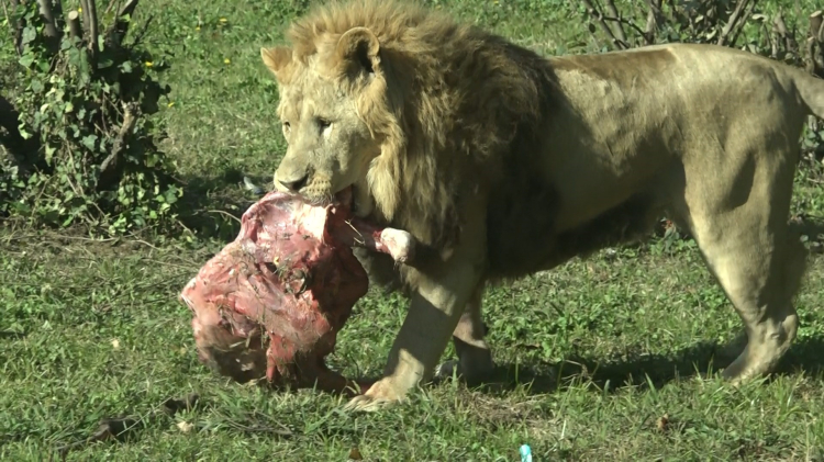 Bulundukları barınaklarından çıkan aslanlar, karkas olarak bırakılan yaklaşık 50 kiloluk eti kısa sürede parçaladı.
