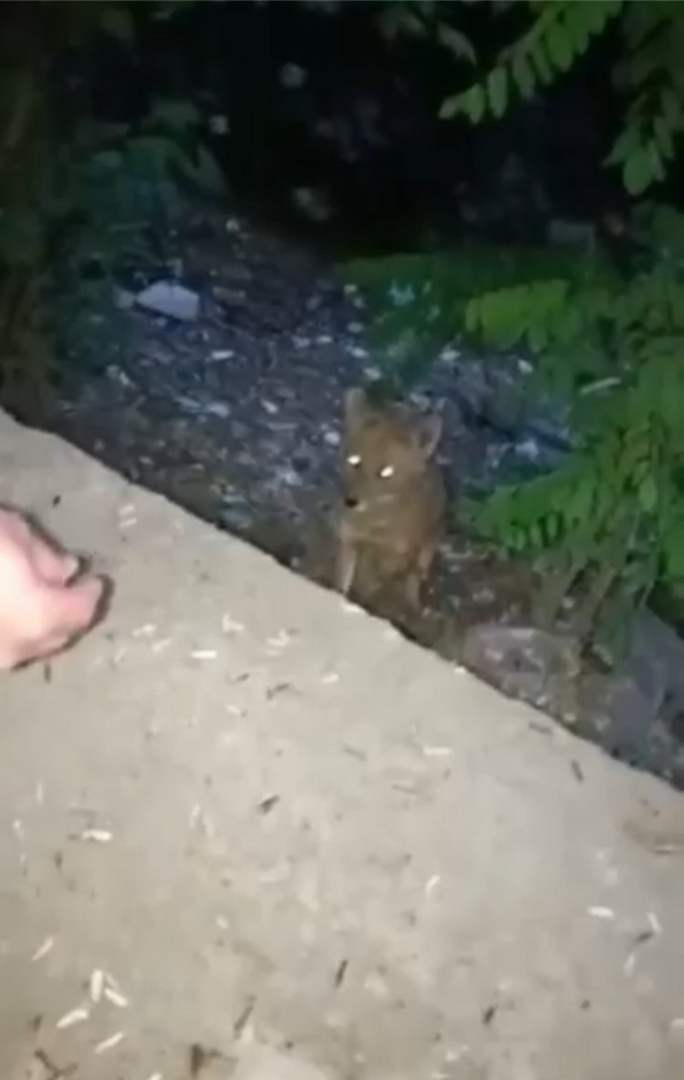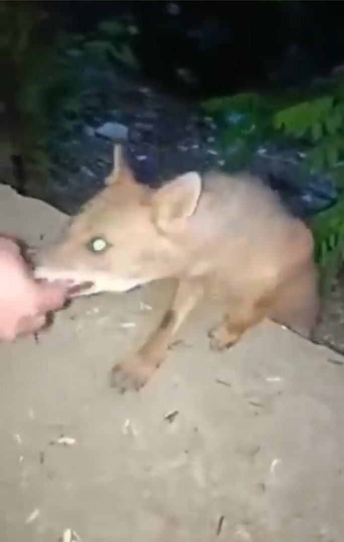 Bir süre boyunca insanların çevresinde gezen tilki yemek ararken vatandaşlardan biri elini yiyecek vermek için tilkiye doğru uzattı.