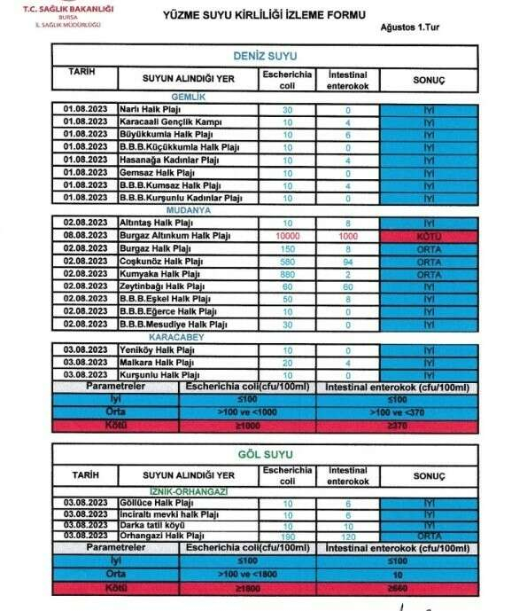 Bursa'da Mudanya, Karacabey ve Gemlik ilçelerinin Marmara Denizi’ne olan kıyıları ile İznik Gölü kıyısındaki plaj ve kamplarda yapılan Ağustos ayı birinci tur ölçümlerinde 24 plajın sonuçları açıklandı. İl Sağlık Müdürlüğü'nün açıkladığı tahlil sonuçlarına göre Bursa'da bulunan 24 plajdan 19'nun su kalitesi iyi çıkarken, 4’u orta, 1’i ise kötü olarak belirlendi.