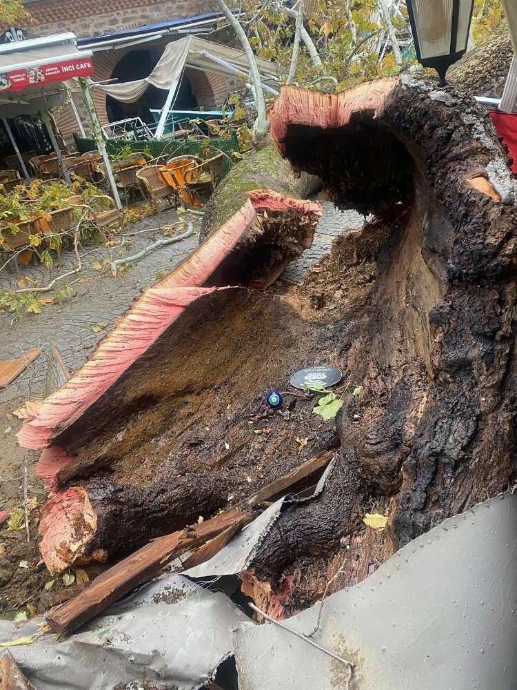 530 yıllık geçmişi bulunan tarihi handa, devasa çınar devrildiği esnada kimsenin bulunmaması muhtemel bir faciayı önledi.