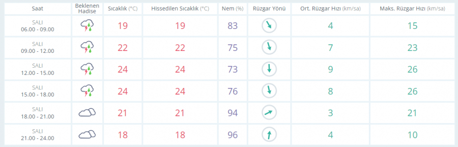 Parçalı ve çok bulutlu, bölge genelinin yerel sağanak ve gök gürültülü sağanak yağışlı geçeceği tahmin ediliyor. Yağışların, Batı Akdeniz'de yer yer kuvvetli olması bekleniyor. Rüzgarın, Doğu Akdeniz iç kesimlerinde güney yönlerden yer yer kuvvetli (40-60 km/saat) eseceği tahmin ediliyor.