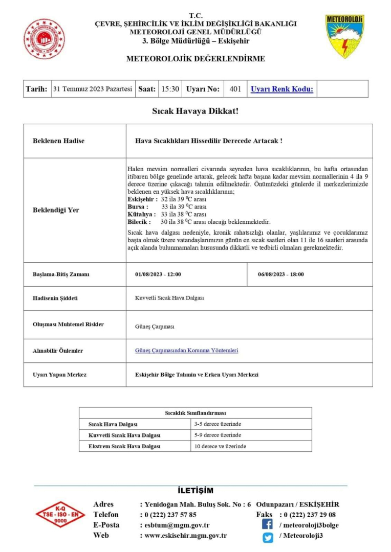 Yüksek sıcaklıkların meydana getirebileceği (güneş çarpması, vücutta sıvı kaybı gibi) olumsuzluklara karşı özellikle; kronik sağlık problemi olanların, yaşlılarımız ve çocuklarımız başta olmak üzere tüm vatandaşlarımızın günün en sıcak saatleri olan 11.00 ile 16.00 saatleri arasında dikkatli ve tedbirli olmaları, açık alanda bulunmamaları gerekmektedir."