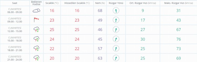 Parçalı ve çok bulutlu, kıyı kesimleri ile Manisa çevrelerinin yerel sağanak ve gök gürültülü sağanak yağışlı geçeceği tahmin ediliyor. Yağışların, Muğla'nın kıyı kesimlerinde kuvvetli, İzmir, Manisa ve Aydın çevrelerinde yerel olarak çok kuvvetli ve şiddetli olması bekleniyor. Rüzgârın, Kıyı Ege'de güneyli yönlerden kuvvetli ve fırtına (50-80 km/saat) şeklinde esmesi bekleniyor.