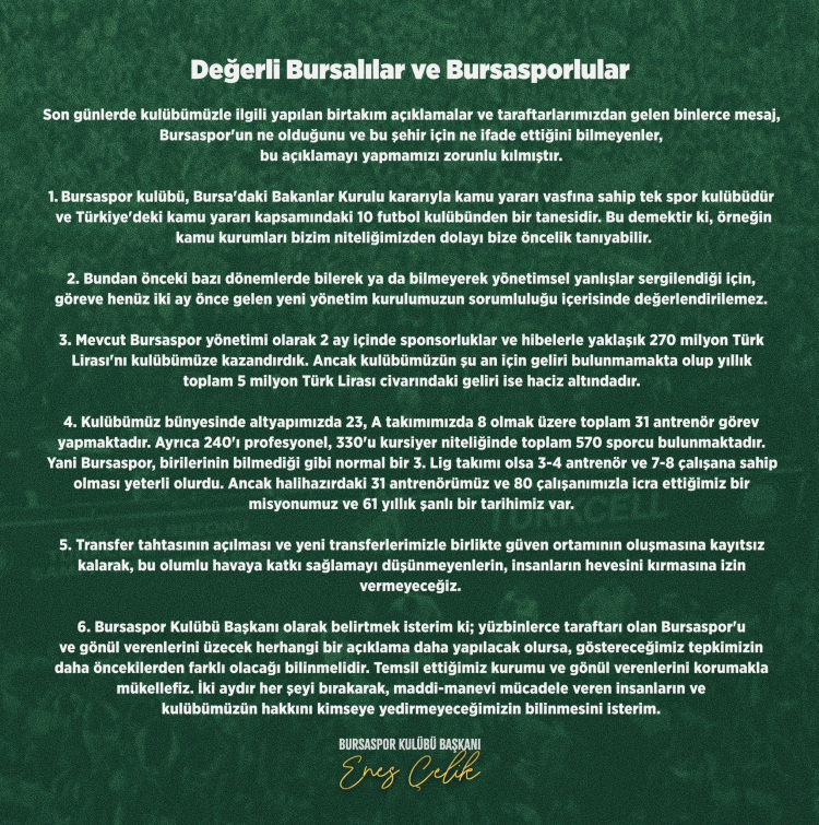 Bursaspor Başkanı Enes Çelik'in sosyal medya hesabından yaptığı açıklama şu şekilde: "Değerli Bursalılar ve Bursasporlular... Son günlerde kulübümüzle ilgili yapılan birtakım açıklamalar ve taraftarlarımızdan gelen binlerce mesaj, Bursaspor'un ne olduğunu ve bu şehir için ne ifade ettiğini bilmeyenler, bu açıklamayı yapmamız' zorunlu kılmıştır.