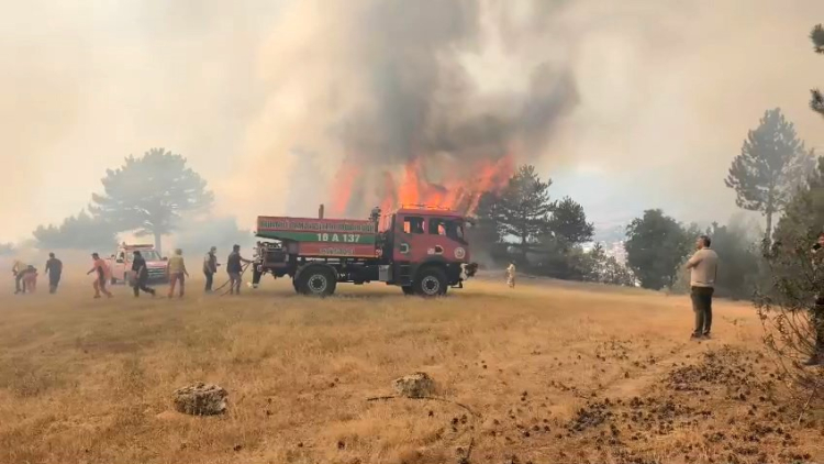 Rüzgarın da etkisiyle ağaçların boyunu geçen alevlere ekipler müdahale ediyor. Vatandaşlar da ekiplere destek veriyor.