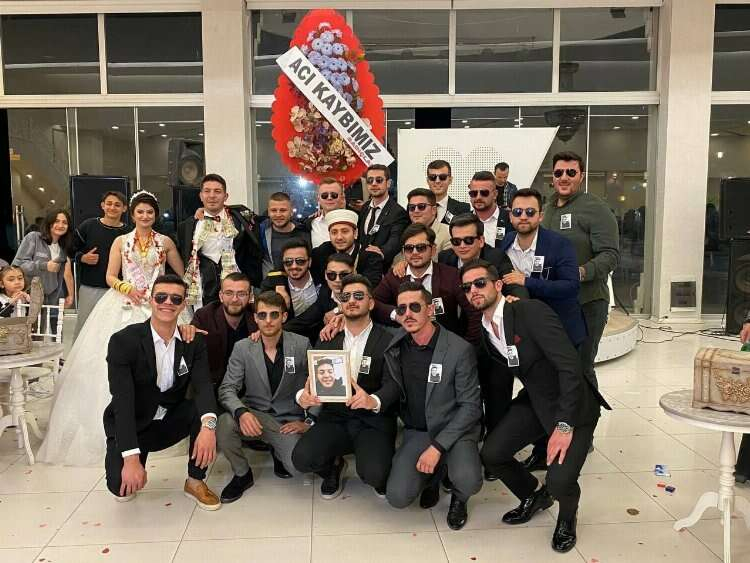 İlçedeki bir salonda gerçekleştirilen düğünde, gelin ile damat takı sırasındayken, hoparlörden önce hüzünlü bir müzik yankılandı. Ardından da damadın arkadaşları, üzerinde ‘Acı kaybımız’ yazılı çelenk ve damadın fotoğrafının olduğu bir çerçeve ile salona girdi.