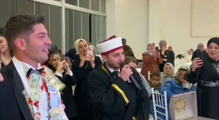İmam gibi giyinen genç eline mikrofonu alarak, cenazedeymiş gibi, damadın sağdıçlarına üç kez, “Barış Uslu'yu bekarlığında nasıl bilirdiniz?” diye sordu. ‘İyi biliriz’ yanıtını alınca bu kez üç kez, “Altınlarınızı helal ediyor musunuz?” diye sordu. ‘Helal ediyoruz’ yanıtını veren sağdıçlar, çifte mutluluklar dileyip, düğün fotoğrafı çektirdi. O anlar davetliler tarafından cep telefonu kamerasıyla görüntülendi.