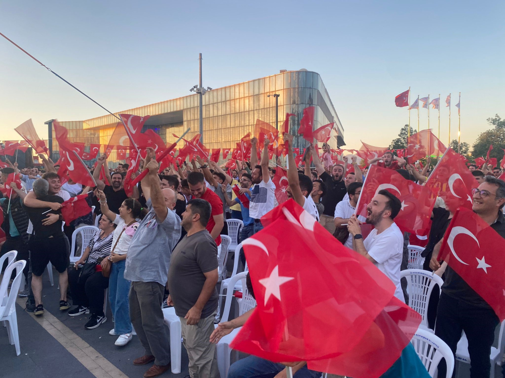 Maç öncesi alanı dolduran vatandaşlar, ellerindeki Türk bayraklarıyla Kent Meydanı’nı adeta stadyuma çevirdi