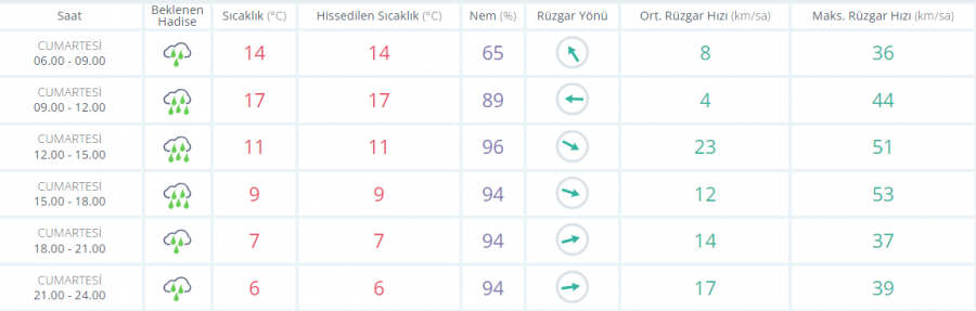Öğle saatlerinden itibaren güneyi yağmur ve sağanak yağışlı geçeceği tahmin ediliyor. Rüzgarın batısında güney ve güneybatı yönlerden kuvvetli ve zaman zaman fırtına (70-90 km/saat) şeklinde esmesi bekleniyor.