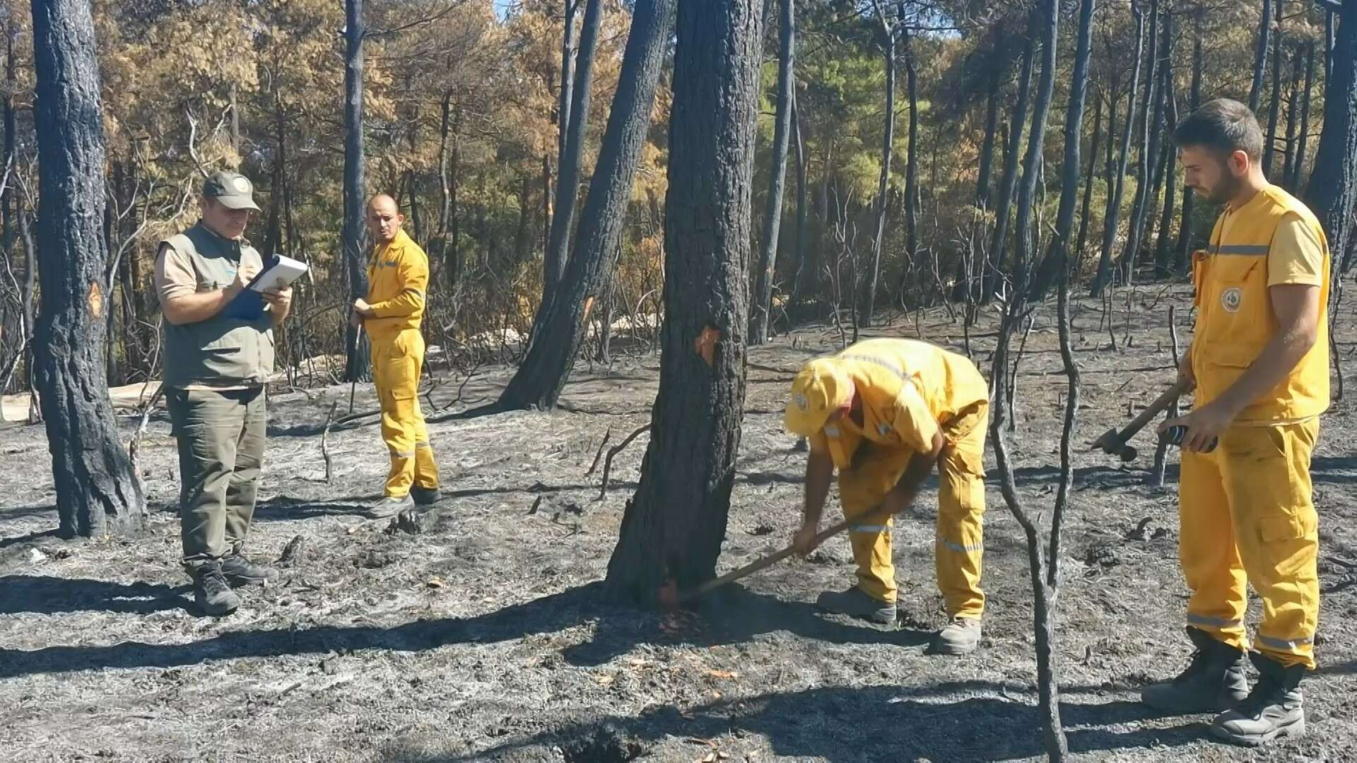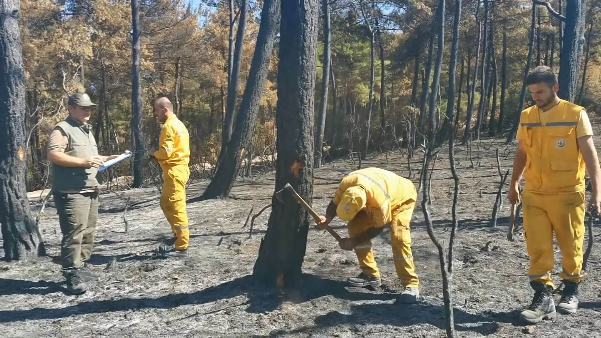 Bursa’nın Mudanya ilçesi Göynüklü Mahallesi'nde 2 Eylül 2023 tarihinde çıkan yangında küle dönen 25 hektarlık alanda tespit çalışmaları sürüyor.
