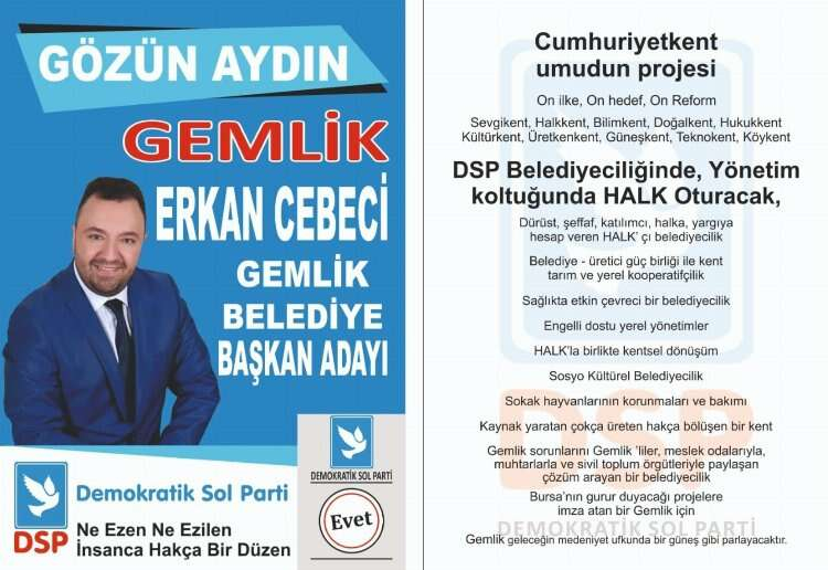 Demokratik Sol Parti (DSP) Gemlik Belediye Başkan Adayı Erkan Cebeci, 31 Mart tarihinde yapılacak olan yerel seçimlerde iddialı olduğunu söyledi.