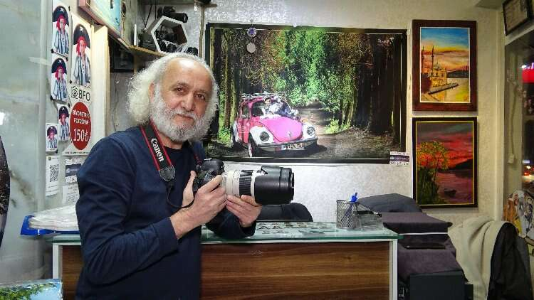 Dükkânında hem fotoğraflarını hem de resimlerini sergiliyor