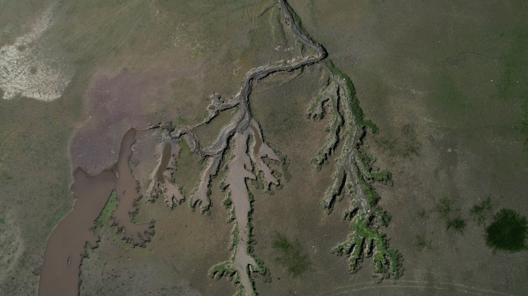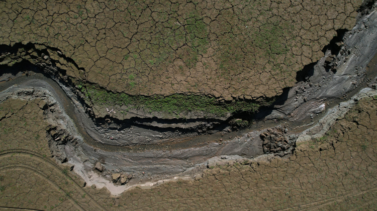Metrelerce çekilen gölün havadan görüntüsü, kuraklığı gözler önüne serdi. Dünyaca ünlü Deveci Armudu'nun yetiştiği tarlalar son hasat öncesi gölün kuruması yüzünden sulanamadı.