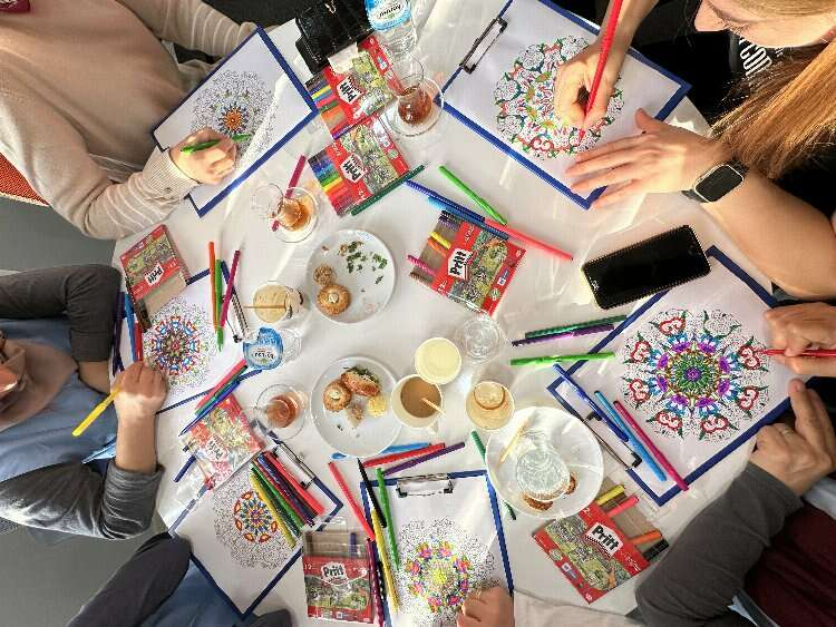 Atölyenin hukuksal haklar bölümünde katılımcılar, mandala atölyesinde boyama yaptıkları esnada sorularını avukat ile paylaşarak daha etkileşimli, interaktif bir eğitim deneyimi yaşadı.