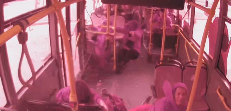 Kaza anı ise otobüsteki kameralara saniye saniye yansıdı. Frenlerden önce ses gelmesi, aracın hızını arttırması dikkat çekiyor. Sürücü ise yokuş aşağıya inerken önce park halindeki bir otomobile arkadan çarpıp hızı azaltıyor ve karşı yöne geçip direğe çarpıyor. İki çarpmanın etkisiyle de otobüs içindeki yolcular yere düşüp sağa sola şiddetli şekilde savruluyor.