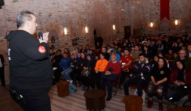 Ördekli Kültür Merkezi’nde gerçekleşen programda genç sporcuların muhtemel bir afet durumu öncesi ve sonrası yapılması gerekenler tek tek aktarıldı.