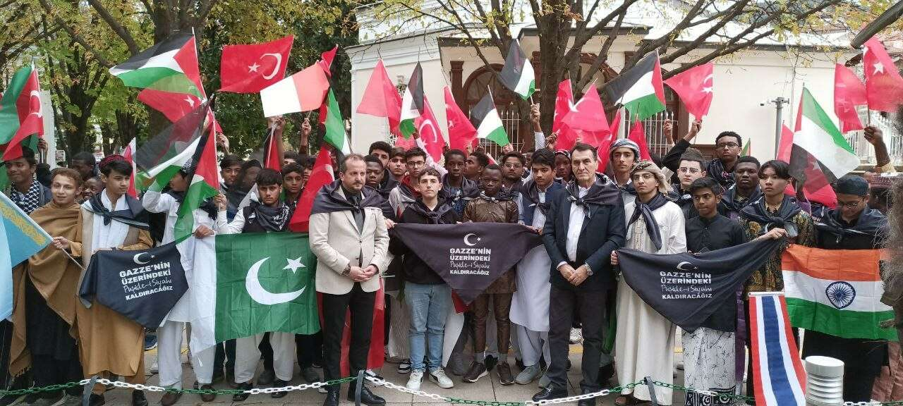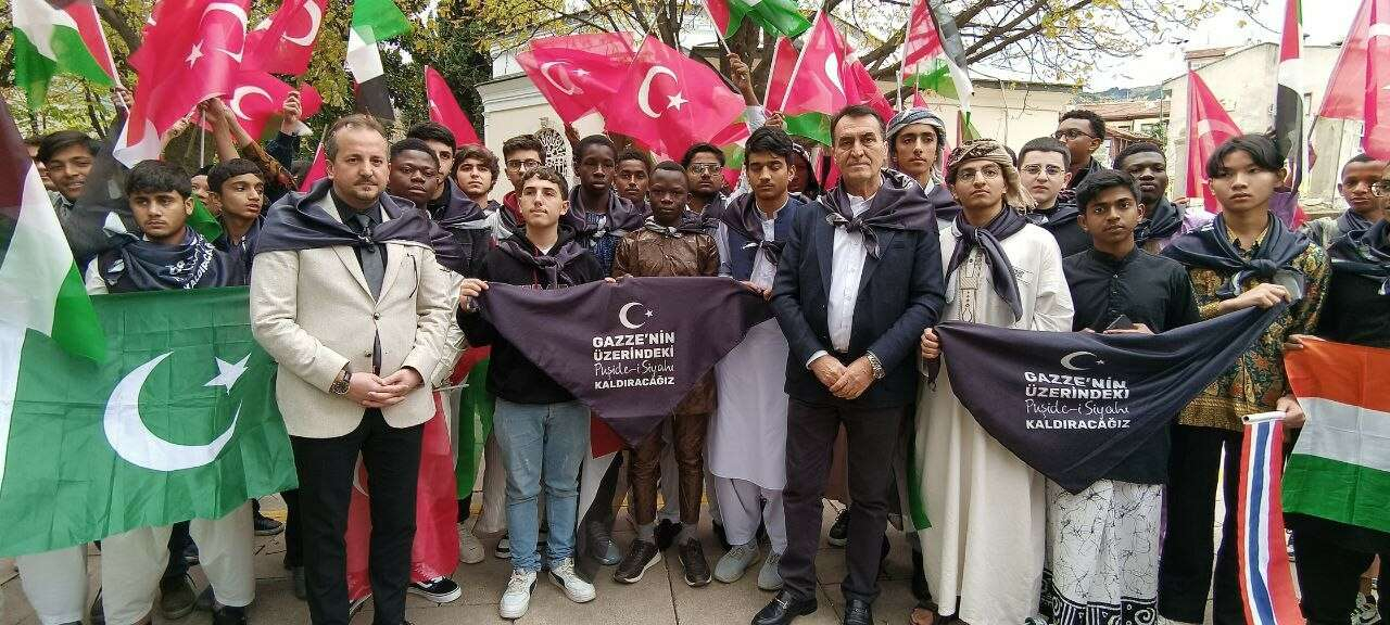 Bursa'da 89 farklı ülkeden 155 öğrencinin eğitim gördüğü proje okulu Osmangazi Belediyesi Uluslararası Murad Hüdavendigar Anadolu İmam Hatip Lisesinin öğrencileri, İsrail'in Filistin'e saldırılarını kınadı. Ülkelerine ait yöresel kıyafetlerini giyen çok sayıda öğrenci, Tophane Meydanı'ndaki Osman Gazi Türbesi önünde bir araya geldi.