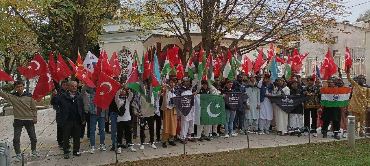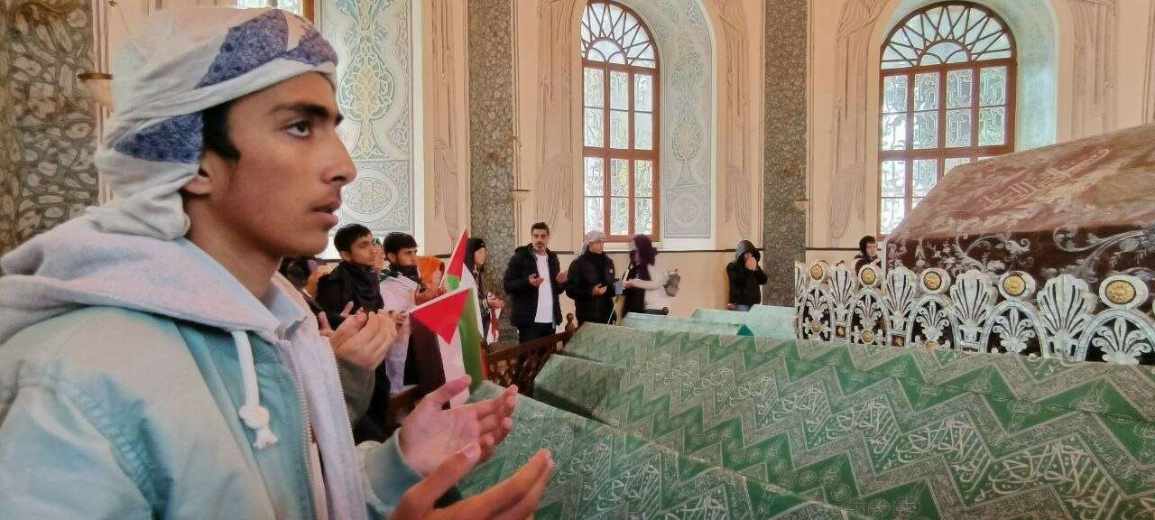 Bursa'da 89 farklı ülkeden 155 öğrenci Osmanlı Devletinin Kurucusu Osmangazi Han'ın türbesi önünde bir araya gelip "Gazze'deki İsrail zulüm son bulsun, çocuklar ölmesin" çağrısında bulundu