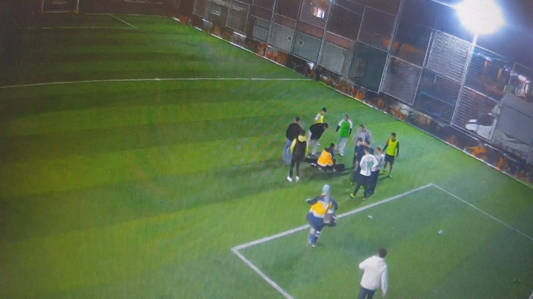 Gencin maç esnasında yere düştüğü ve arkadaşları ile 112 ekiplerinin müdahaleleri işletmenin güvenlik kamerasına saniye saniye yansıdı.