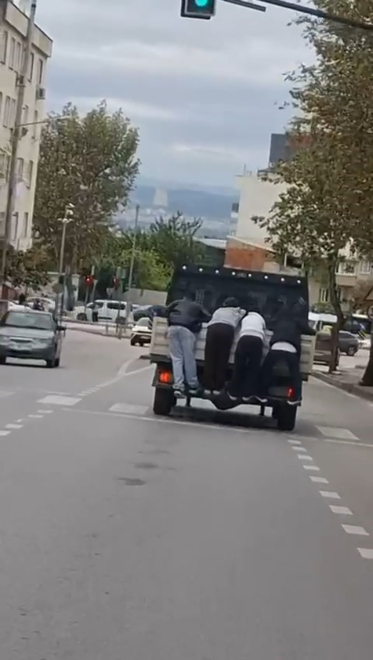 Diğer görüntülerde ise yine otobüsün arkasına tutunan ile kamyonetin kasasına asılarak ilerleyen gençler, 'pes' dedirtti. Kazaya davetiye çıkaran gençlerin ne zaman akıllanacağı ise sosyal medyada merak konusu oldu.