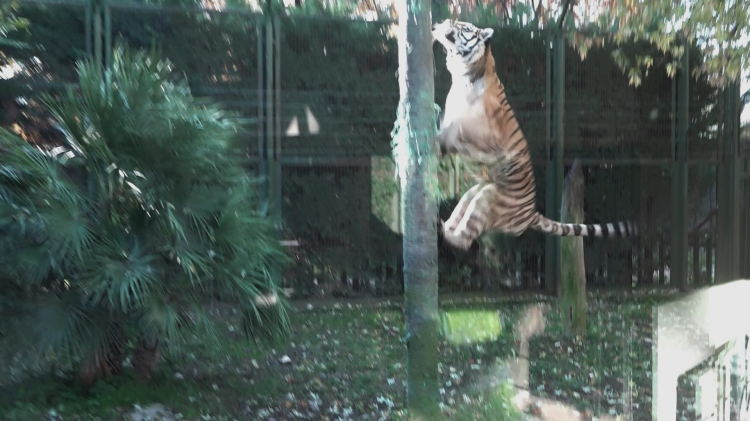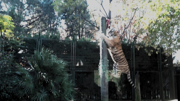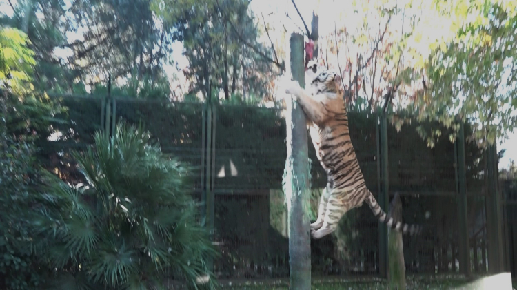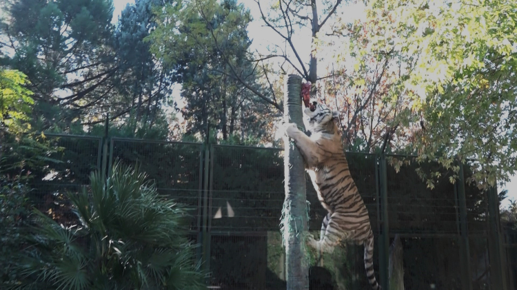 Direğin üzerine bakıcısı tarafından asılan etin kokusunu alan amur kaplanı, yuvasından çıktıktan sonra gözüne kestirdiği eti tek hamlede kaptı. Afiyetle etini yiyen kaplan, bu egzersizlerle ormanda yaşamış gibi zinde ve çevik kalıyor.