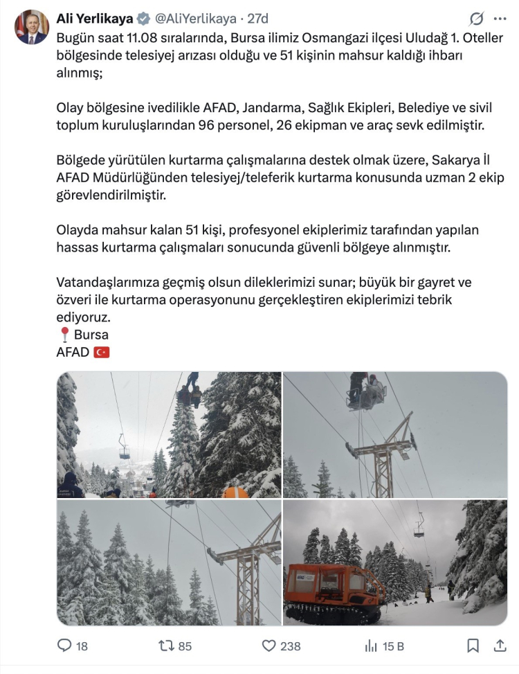 İçişleri Bakanı Ali Yerlikaya, Uludağ'da telesiyejde mahsur kalan 51 tatilcinin kurtarılma operasyonuna 96 arama kurtarma personeli ile 26 aracın katıldığını bildirdi. Bakan Yerlikaya, koordineli çalışmaları dolayısıyla Jandarma Arama Kurtarma (JAK) ve AFAD başta olmak üzere tüm ekiplere teşekkür ederek, özverili çalışmalarından dolayı görevlileri tebrik etti.