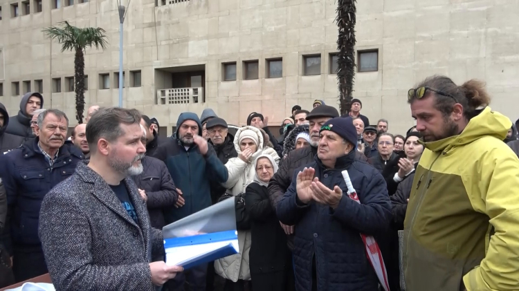 Bursa Adalet Sarayı önünde basın açıklaması yapan mağdurlar, “ 8 yıl önce 192 hak sahibi tapulu arazisini kentsel dönüşüm çerçevesinde bir müteahhide yerini veriyor. 8 yıldır aynı müteahhit bu siteyi bitirmemek için elinden geleni yapıyor. Çünkü burayı kendine göre ayarlamaya çalışıyor. Ne belediye ne de karakol buna bir şey yapamıyor. Dolasıyla bu kişi burada farklı sözleşmeler ile başka kişilere daire satıyor. 5 blokta yüzde 70 civarında oturanlar var. Onlar kendi dairelerine zaten zorla geçti. Yani burada müteahhit, daire sahiplerini caydırıp yerleri kendi alabilmesi için suç işliyor. 24 aylık bir sözleşme varken, 8 yıldır bu site tam olarak yapılmış değil. 428 kişi şu anda mağdur, çoğu kişi yıllardır kirada kalıyor” ifadelerini kullandı.