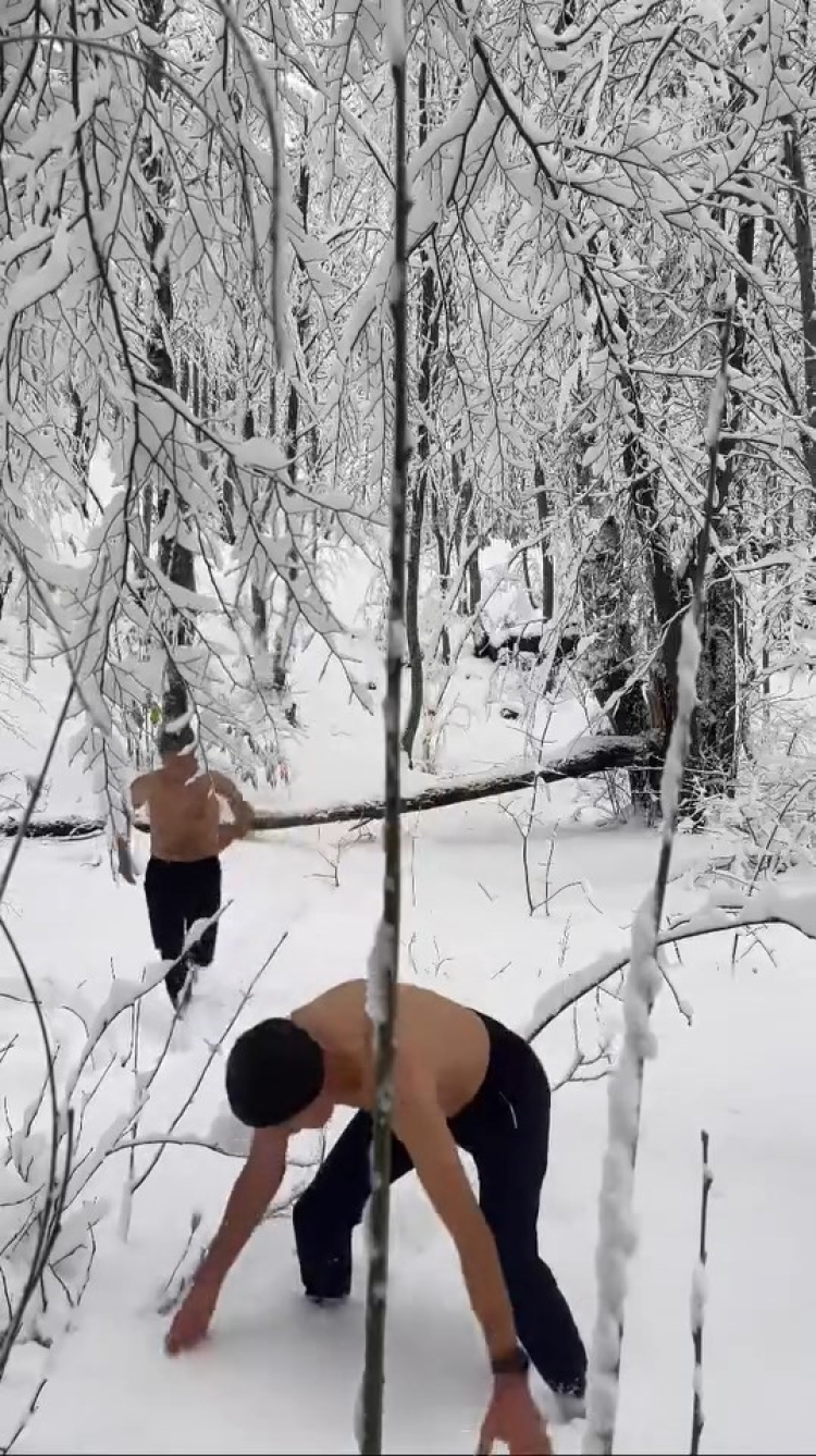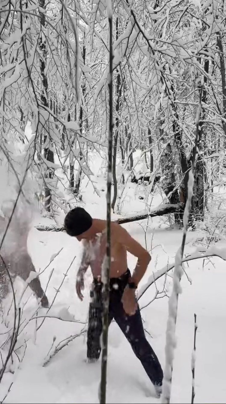 İki arkadaş, Dondurucu Soğuğa Aldırış Etmeden Kar Banyosu Yaptı
