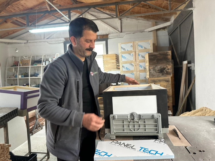"Sandviç panelli kovanlarımız ısı yatılımı sağlıyor. Polen tuzaklı kovan bunlar. Bu kovanlarda rutubet ve nem terleme oranı çok daha düşük. Sandviç paneller çevre dostu bir malzemeden yapılıyor. Diğer kovanlar genellikle çam ağacından yapıldığı için ağır oluyorlar. Biz ithal Sibirya ladini kullanıyoruz. Bunlar daha hafif oluyor. Çerçevede bile bu ladinlerden kullanıyoruz."
