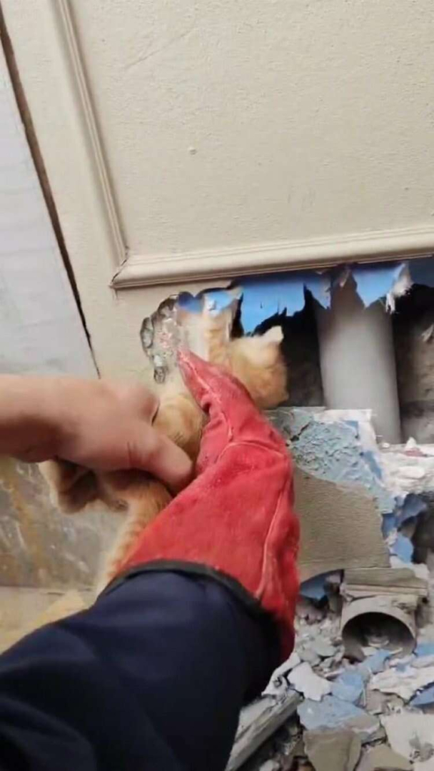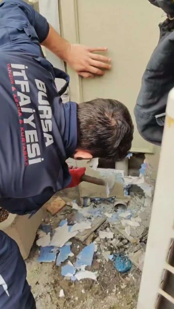 Bursa’da duvar içerisinde sıkışan yavru kediyi Bursa itfaiyesi kurtardı. O anlar saniye saniye amatör kameraya yansıdı.