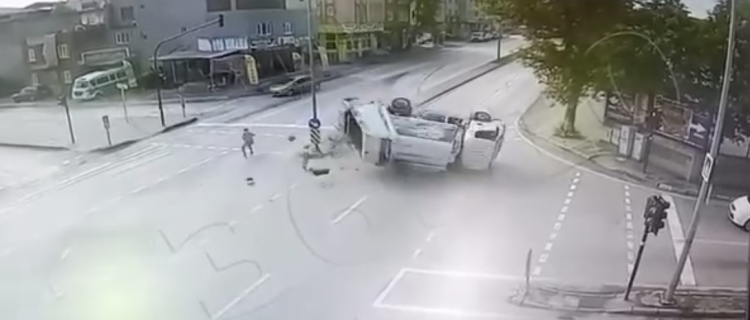 Çarpmanın etkisiyle takla atan kamyon ters dönerken, ortalık savaş alanına döndü. Kaldırımda bekleyen bir vatandaş ise kazayı kıl payı atlattı. Kazayı gören vatandaşlar sürücünün yardımına koşarken, o anlar güvenlik kamerasına saniye saniye yansıdı.