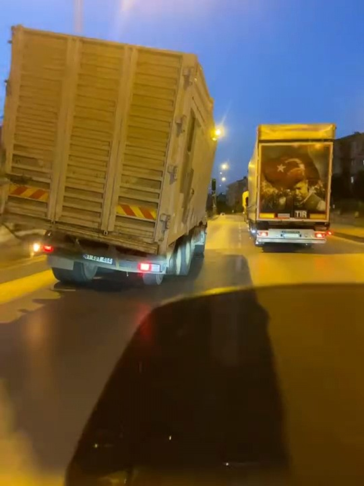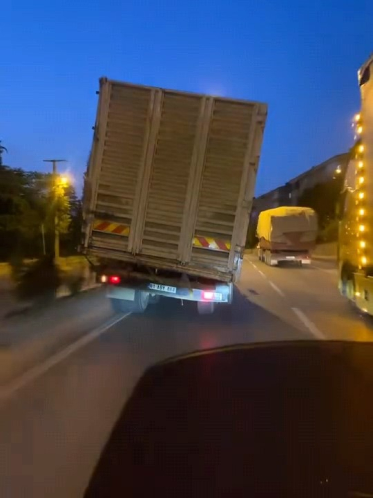 Vatandaşlar, bu tehlikeli durumu cep telefonlarıyla kaydederken, olay sosyal medyada da kısa sürede gündem oldu. Görüntülerde kamyonun sağa doğru ciddi bir şekilde yatmış olduğu ve sürücünün hiçbir önlem almadan yoluna devam ettiği görülüyor.