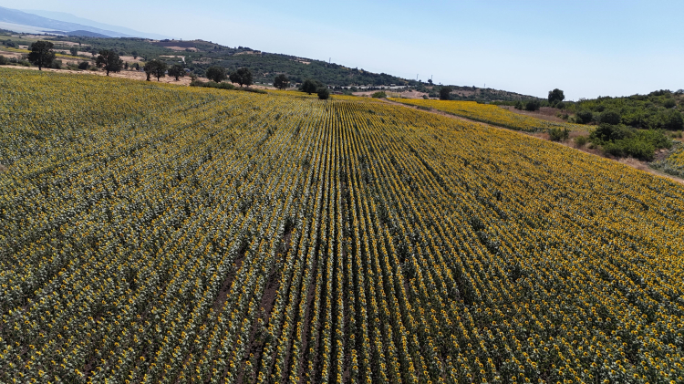 Bursa'nın tarım cenneti Karacabey'de ayçiçekleri çiçek açtı, doğa sarı ve yeşilin muhteşem uyumuna büründü.