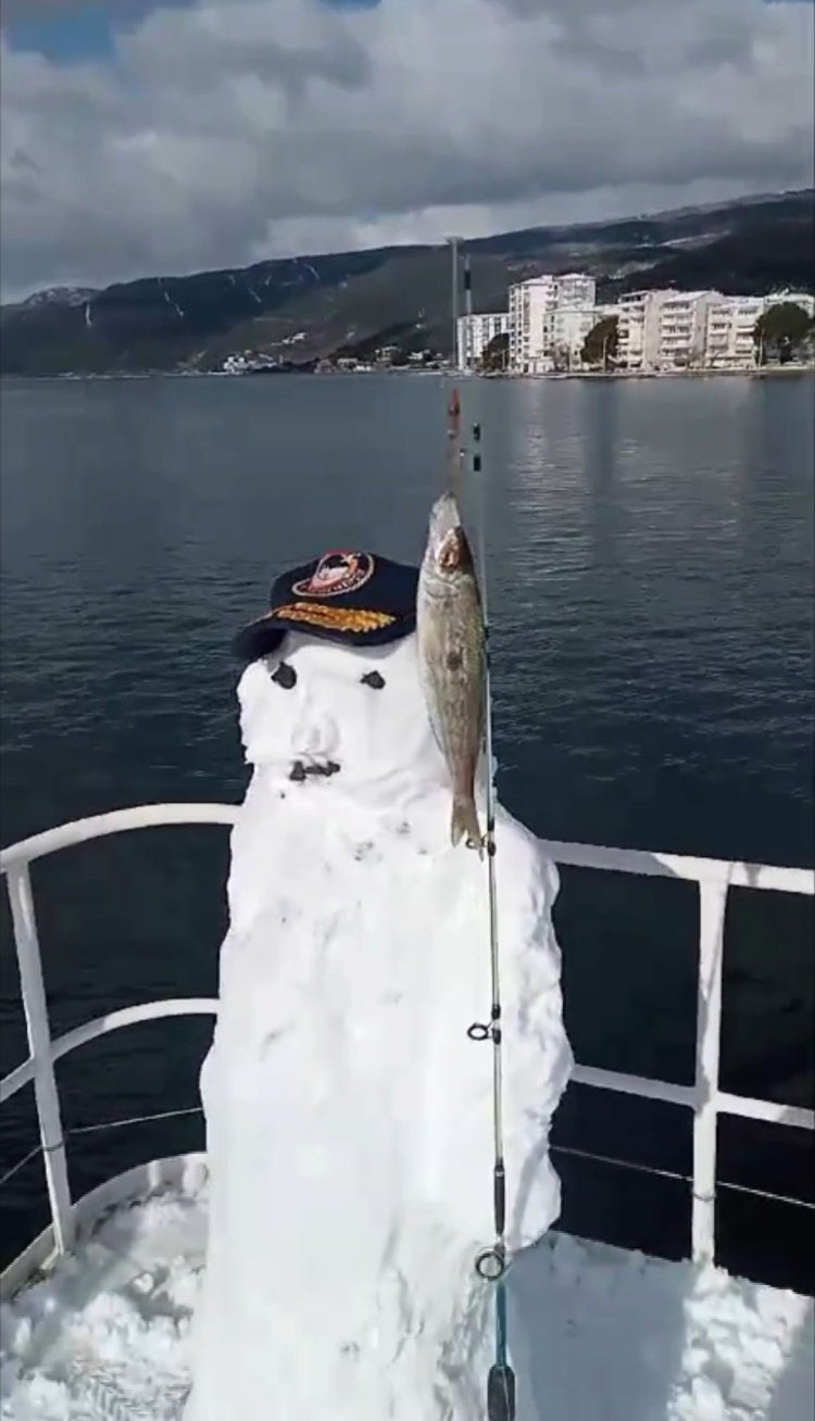 Gemlik ilçesinde denize açılan balıkçı grubu, balık tutmayı bırakarak teknede biriken karlar ile kardan adam yaptı.