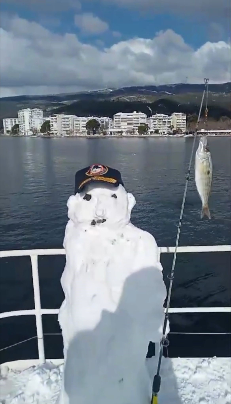 Yaptıkları kardan adama "Mülayim" adını veren balıkçılar; eline de olta ve balık koyup o anları ölümsüzleştirdi.