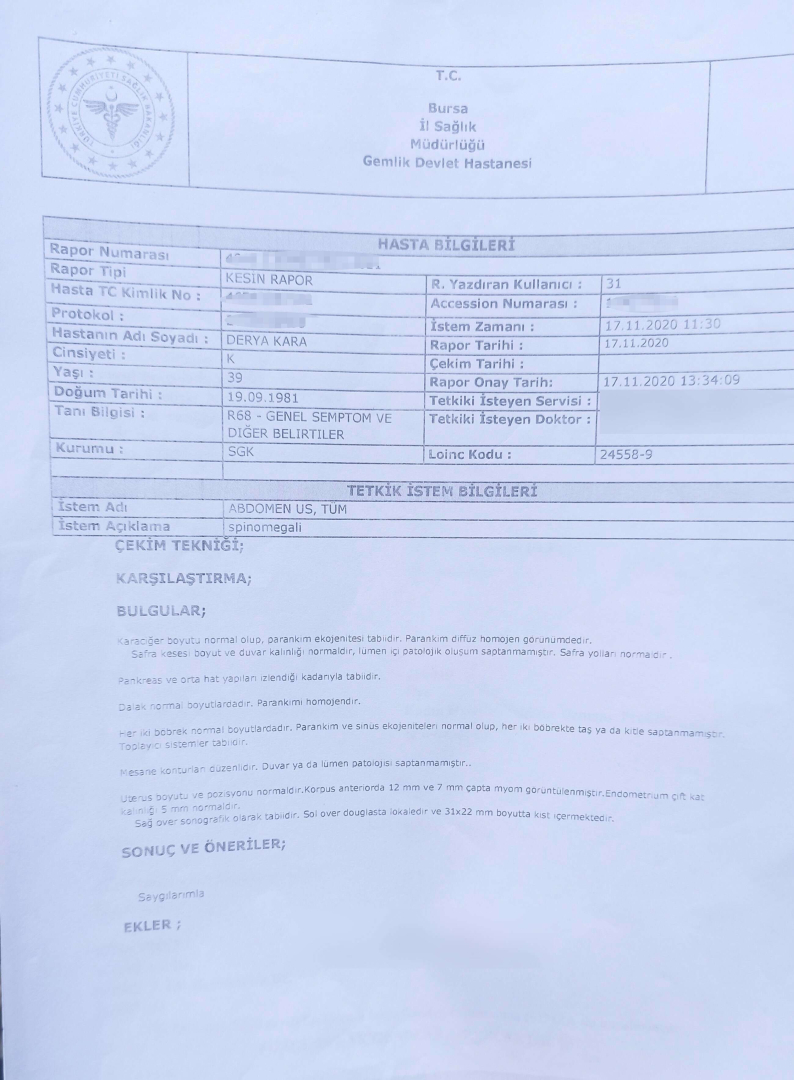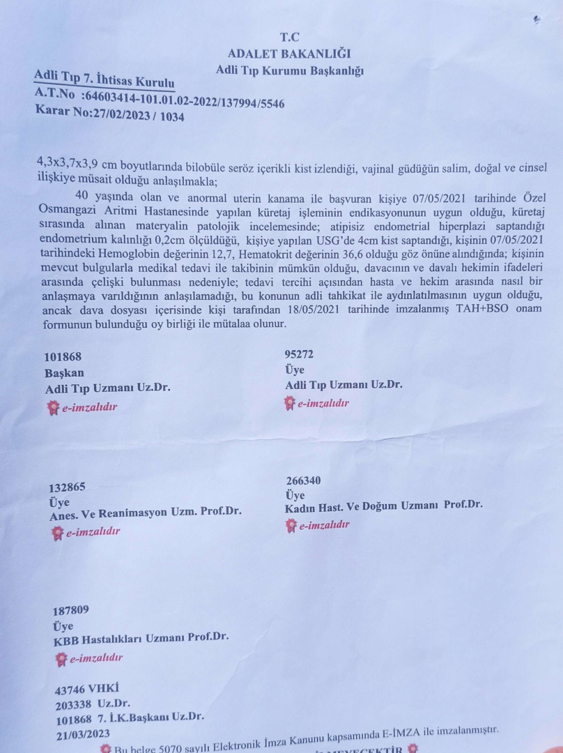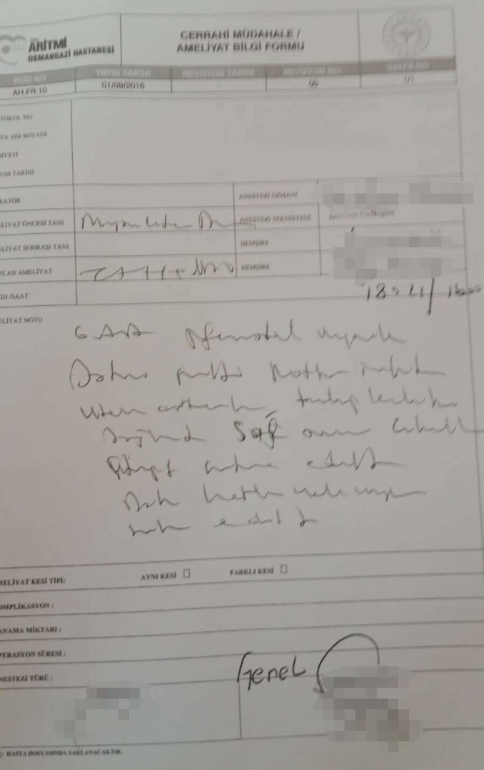 Bursa’da karın ağrısı şikayetiyle 6 Mayıs 2021 tarihinde Osmangazi Aritmi Hastanesine giden 41 yaşındaki Derya Kara, kadın doğum uzmanı tarafından muayene edildi. Yapılan tahliller ve muayenenin sonucunda küçük bir operasyon geçireceği söylenen Kara, ağrıları sebebiyle kabul etti. Rahim duvarının kazındığını ve patoloji için parça alındığını belirten Kara, doktorun ‘hiçbir sorunun kalmadı’ demesiyle rahat bir nefes aldı. Hafif ağrıları devam eden Kara, 10 gün sonra gelen patoloji sonucu ile dünyası başına yıkıldığını iddia etti.