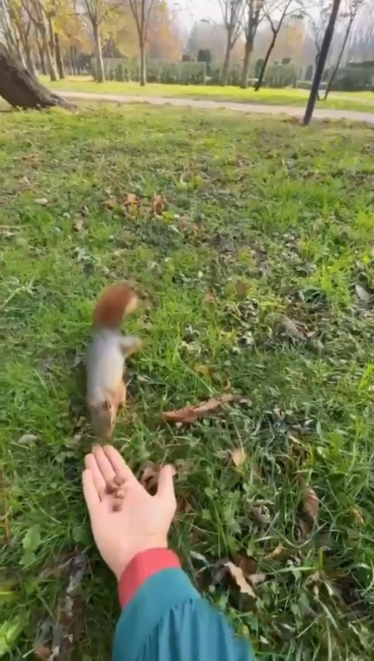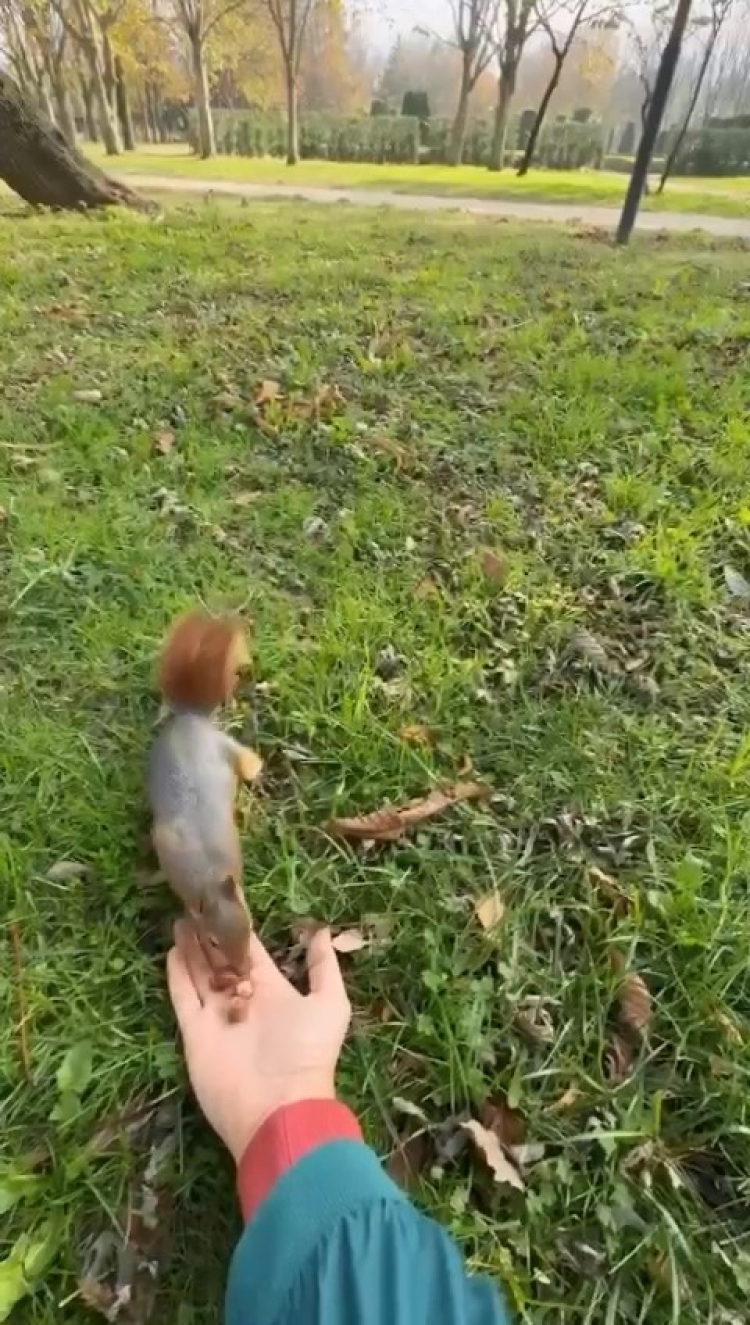 Bursa'da Reşat Oyal Kültür Parkı'nda gezen bir vatandaş, karşılaştığı sincabı elleri ile besleyip o anları kayıt altına aldı.