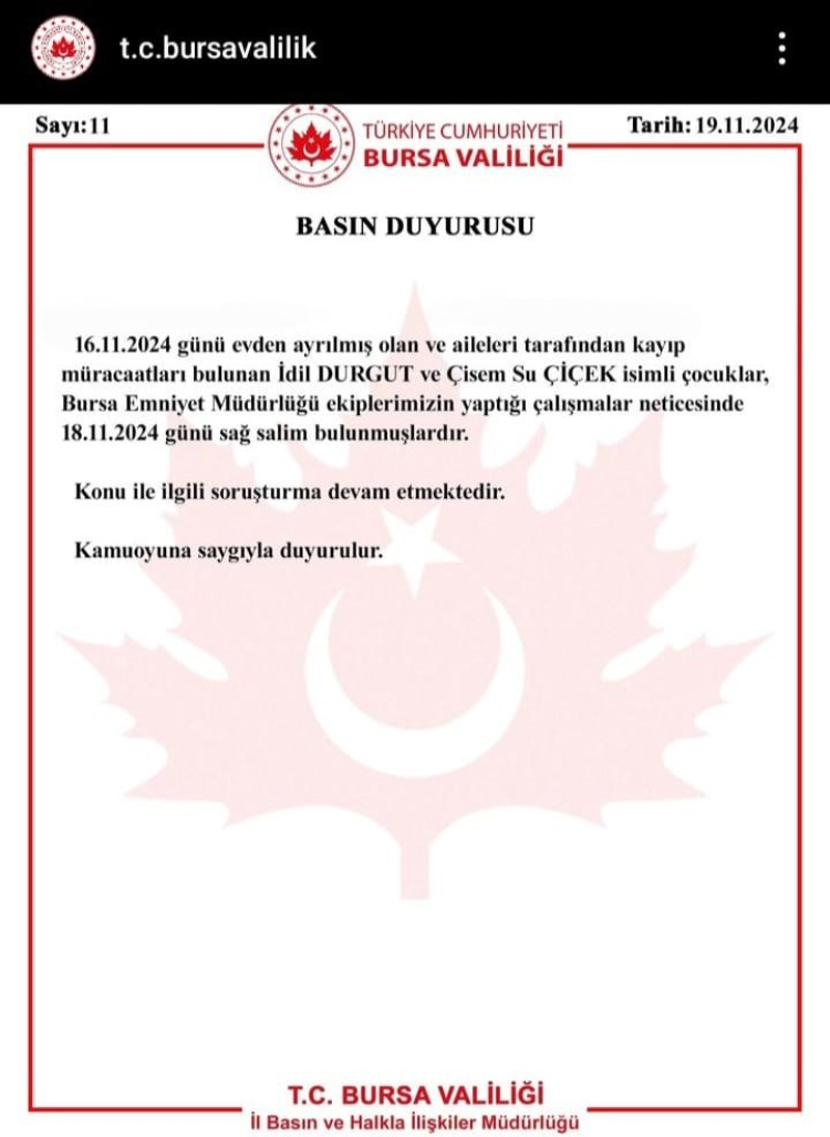 Konu ile ilgili olarak Bursa Valiliği tarafından yapılan açıklamada, "16.11.2024 günü evden ayrılmış olan ve aileleri tarafından kayıp müracaatları bulunan İdil Durgut ve Çisem Su Çiçek isimli çocuklar, Bursa Emniyet Müdürlüğü ekiplerimizin yaptığı çalışmalar neticesinde 18.11.2024 günü sağ salim bulunmuşlardır. Konu ile ilgili soruşturma devam etmektedir." ifadelerine yer verildi.