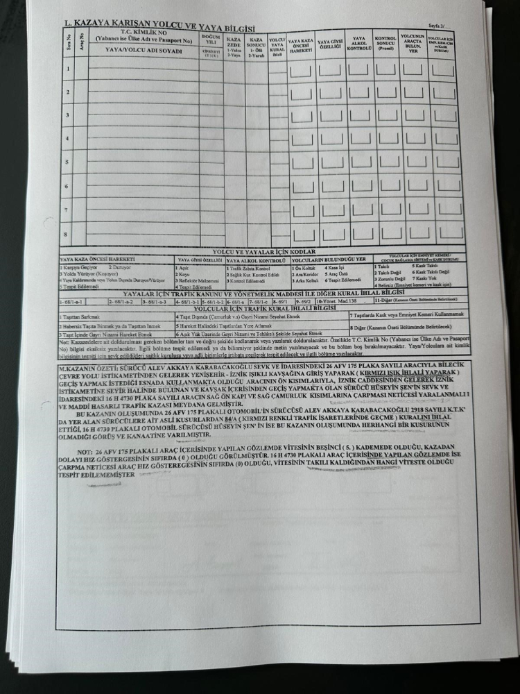 Kaza sonrası polis ekiplerinin tutanaklarına sürücü Alev Akkaya Karabacakoğlu'nun “kırmızı ışık ihlali” yaptığı, sürücü Hüseyin Şen'in kusuru bulunmadığı işlendi. Ayrıca sürücü Karabacak'ın kaza esnasında 5'inci viteste seyrettiği ortaya çıktı.