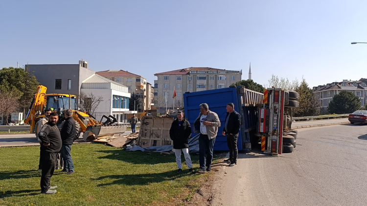 Kaza, saat 15.30 sıralarında Bursa-Ankara kara yolu üzeri İnegöl girişindeki köprülü kavşakta meydana geldi. Bursa'dan gelip İnegöl'e dönüş yapmakta olan Cengiz K. (44) yönetimindeki 35 CZZ 70 plakalı ahşap palet yüklü kamyon, sürücüsünün kontrolünden çıkarak devrildi.