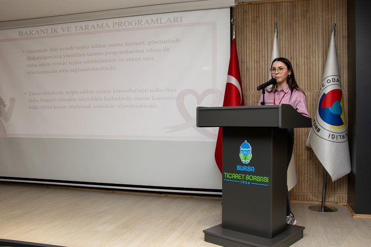 Bursa Ticaret Borsası (Bursa TB) koordinatörlüğünde faaliyetlerini sürdüren Türkiye Odalar ve Borsalar Birliği (TOBB) Bursa Kadın Girişimciler Kurulu, Meme Kanseri Farkındalık Ayı kapsamında, Uludağ Onkoloji Dayanışma Derneği (ONKODAY) ve Osmangazi İlçe Sağlık Müdürlüğü Kanser Erken Teşhis Tarama ve Eğitim Merkezi (KETEM) iş birliğiyle “Bilgilendirme ve Farkındalık” semineri düzenledi.