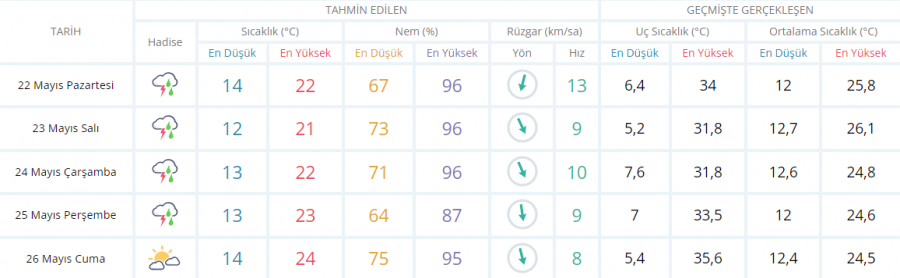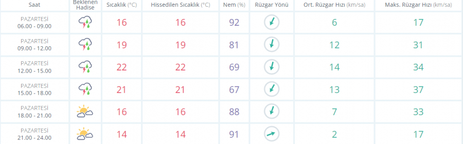 Ülkemiz genelinin parçalı ve çok bulutlu, Marmara'nın güneyi, Ege, Akdeniz, İç Anadolu, Karadeniz'in iç kesimleri, Doğu ve Güneydoğu Anadolu ile Edirne ve Tekirdağ çevrelerinin yerel olmak üzere sağanak ve gök gürültülü sağanak yağışlı geçeceği tahmin ediliyor. Yağışların: İç Ege, Batı Akdeniz'in iç kesimleri, İç Anadolu'nun kuzeybatısı, Orta Karadeniz'in iç kesimleri ile Bilecik, Kırşehir, Kırıkkale, Yozgat, Bolu ve Tunceli çevrelerinde yerel olarak kuvvetli olması bekleniyor. Rüzgarın: Doğu Akdeniz ile Doğu ve Güneydoğu Anadolu'nun batısında güneyli yönlerden kuvvetli (40-60 km/saat) olarak eseceği tahmin ediliyor. Doğu Akdeniz, Doğu Anadolu'nun güneydoğusu ile Güneydoğu Anadolu'da toz taşınımı bekleniyor.