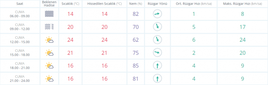 Meteoroloji Genel Müdürlüğü tarafından yapılan son değerlendirmelere göre: Ülkemizin güney kesimlerinin parçalı, yer yer çok bulutlu, Hatay, Bitlis ve Van çevreleri, Antalya'nın batısının iç kesimleri, Denizli'nin güneyi ile Hakkari'nin kuzey kesimlerinin yerel olmak üzere sağanak ve gök gürültülü sağanak yağışlı, diğer yerlerin az bulutlu ve açık geçeceği tahmin ediliyor. Gece ve sabah saatlerinde Marmara'nın güney ve doğusu, İç Ege ile Karadeniz'in iç kesimlerinde yer yer pus ve sis bekleniyor.
