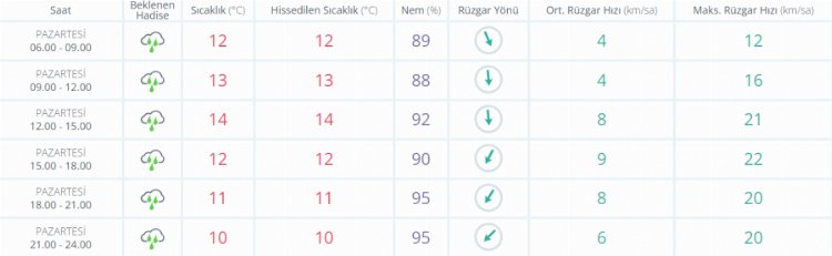 Haftanın üçüncü iş gününde (ÇARŞAMBA) sabah saatlerinde sıcaklığı 8 derece seviyelerinde ölçülüyor. Gün içerisinde yağış geçişleri yüzünü göstermeye devam ederken çok bulutlu gökyüzüyle birlikte en yüksek termometreler 15 derece seviyelerinde ölçülüyor.