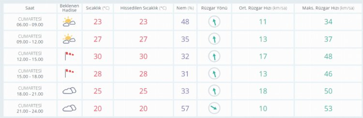 Parçalı bulutlu geçeceği tahmin ediliyor. Rüzgârın, Kıyı Ege'de güneyli yönlerden kuvvetli ve fırtına (50-70 km/saat) şeklinde esmesi bekleniyor. Gece ve sabah saatlerinde iç kesimlerde yer yer pus ve sis bekleniyor.